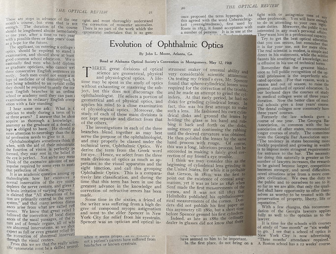 This article was originally written by By John L. Moore, Atlanta, Ga., and read at Alabama Optical Society’s Convention in Montgomery, May 12, 1908, which is believed to now be public domain.