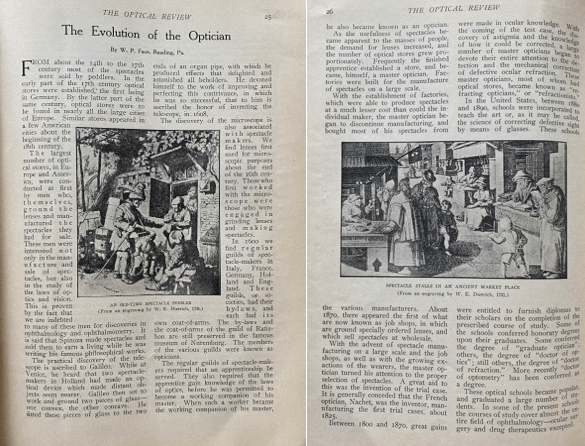 This article was originally written by W. P. Face, Reading, PA, and published in the 1908-1909 Optical Review, which is believed to now be public domain.